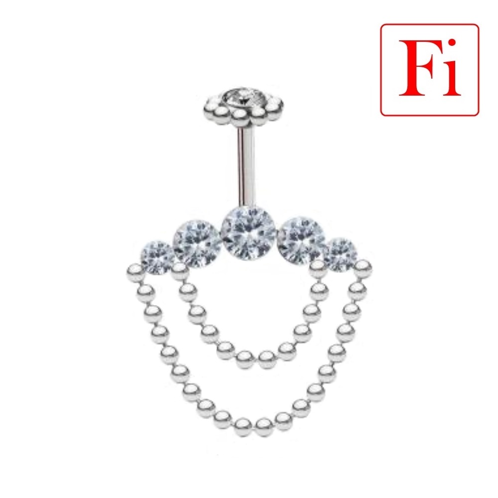 - il corpo gioiello è formato da cinque brillantini Zirconia Cristallo chiaro montati su struttura in acciaio e doppia catenella pendente.