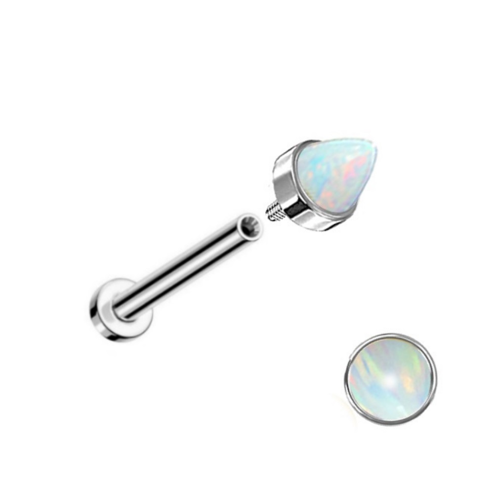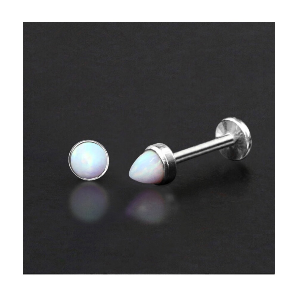 Gioiello labret in Acciaio chirurgico colore “naturale” con cono in Opale sintetico Bianco.