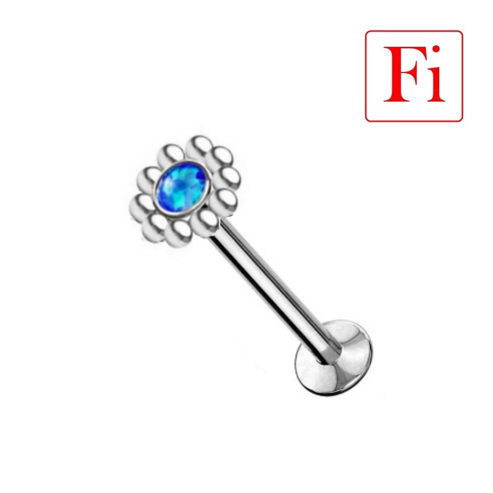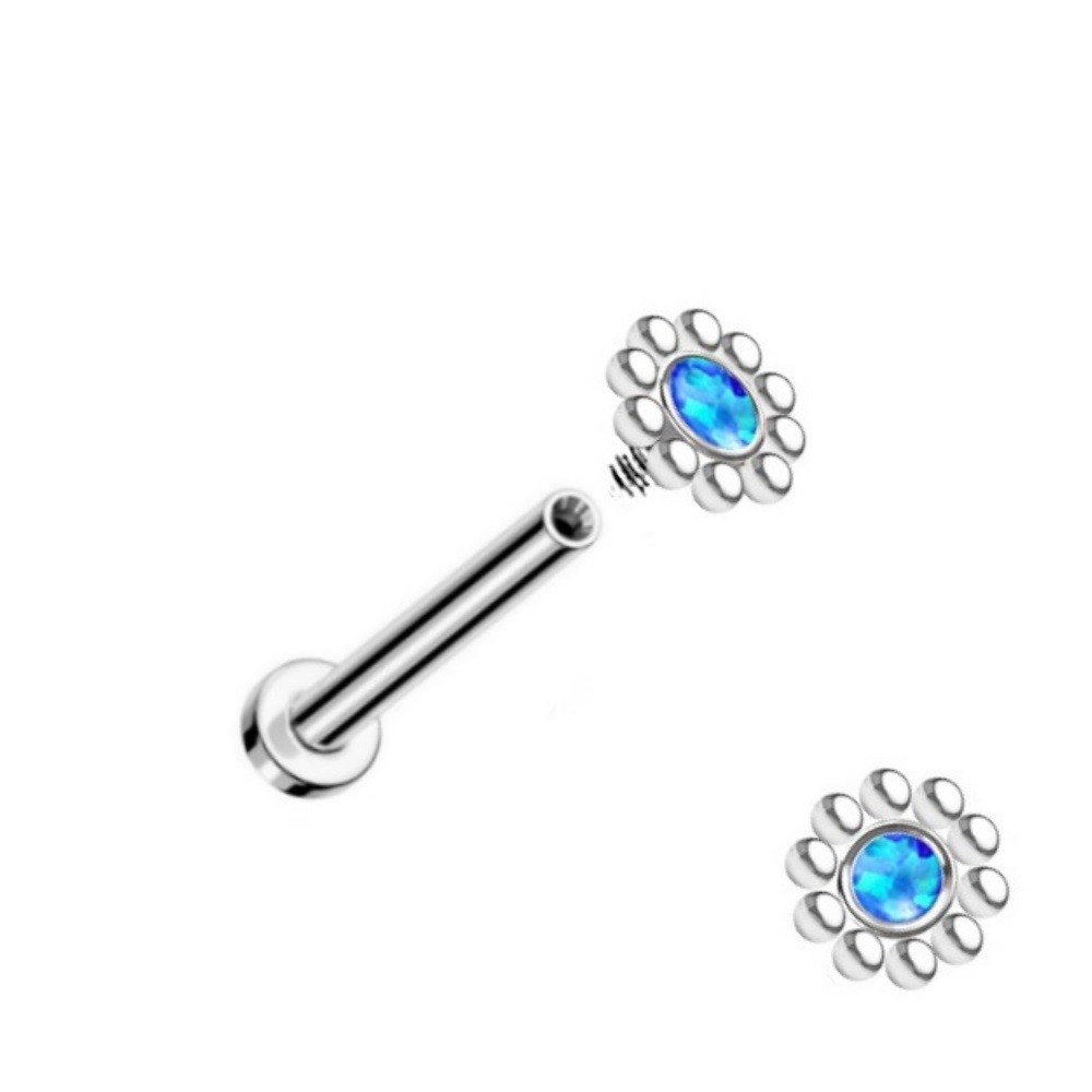 Gioiello labret in Acciaio chirurgico colore “naturale” con corona microsfere e Opale blu