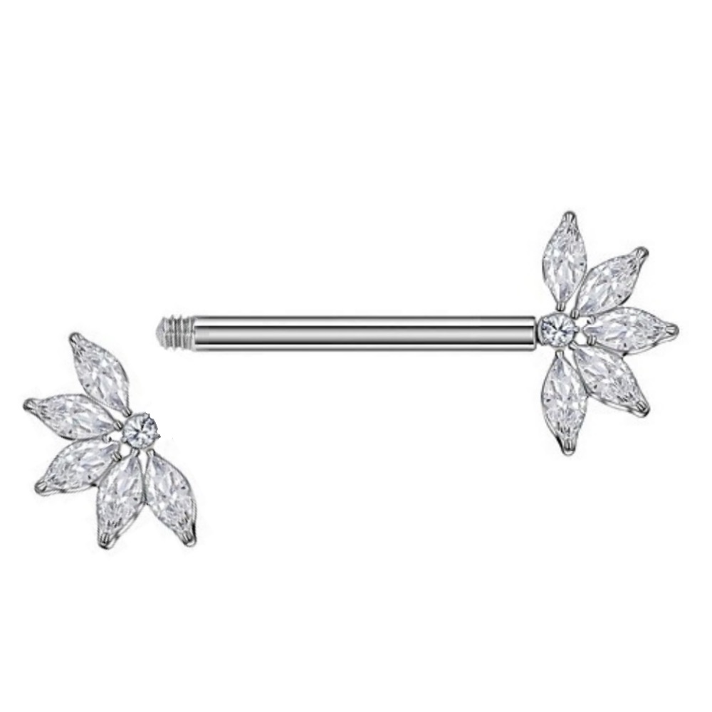 Barra in acciaio chirurgico con Filettatura maschio, di colore ” naturale ” con due accessori su entrambi i lati, di cui uno amovibile (e l’altro fa da chiusura con avvitatura).